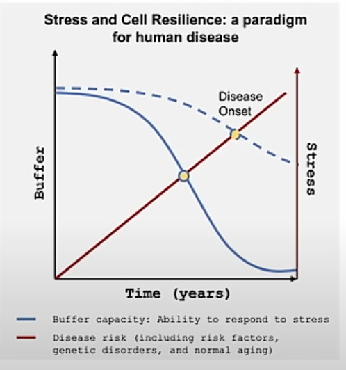 Juan Carlos Izpisua Belmonte from Altos Labs gave a wonderful talk in 2024 on how this impacts disease onset. As time passes, our cells buffer capacity declines, meaning our risk of disease increases—leading to disease onset.