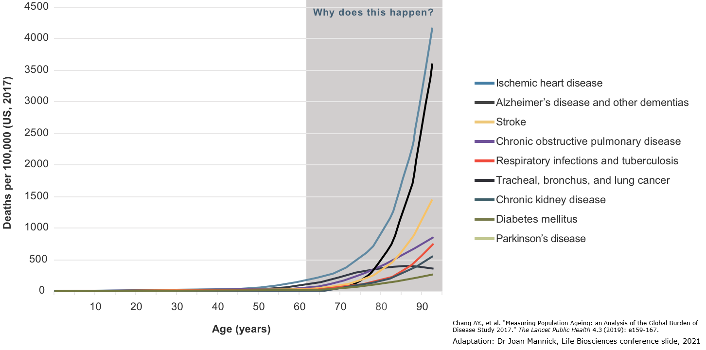 The reason for this increase in funding and research into aging is due to a shift in perspective. Aging is no longer seen as an inevitable process that our bodies must endure. Instead, we understand the causes of aging, and see aging as an underlying risk factor for disease.